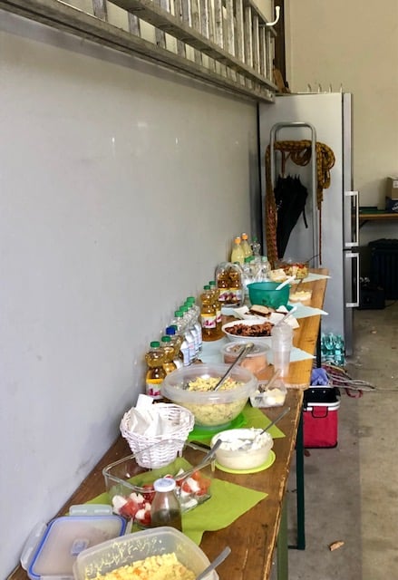 Die Rückfahrt erfolgte dann zügig, da das das Wetter umschlug. Bei leichtem Nieselregen erreichten wir Tastrup, wo uns bereits unsere treuen Helfer, Heiner Hinrichsen, Wolfgang Neumann und Dietmar Kraus mit Leckereien vom Grill erwarteten. Unsere Tastruper LandFrauen haben fleissig geholfen, die Tische zu dekorieren und ein sehr schönes und abwechslungsreiches Salatbuffet zu zaubern.