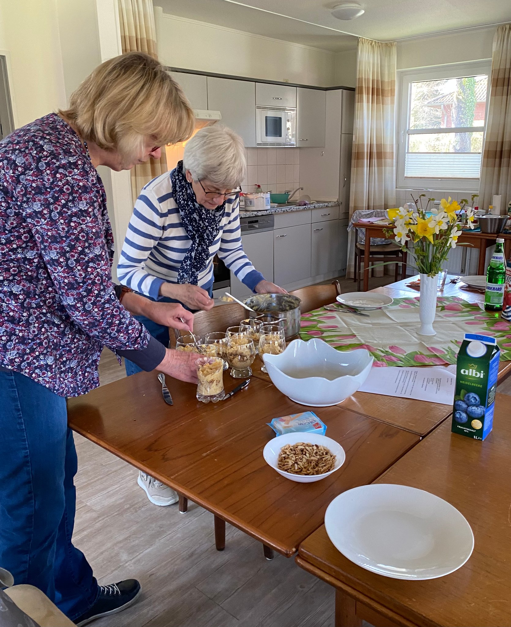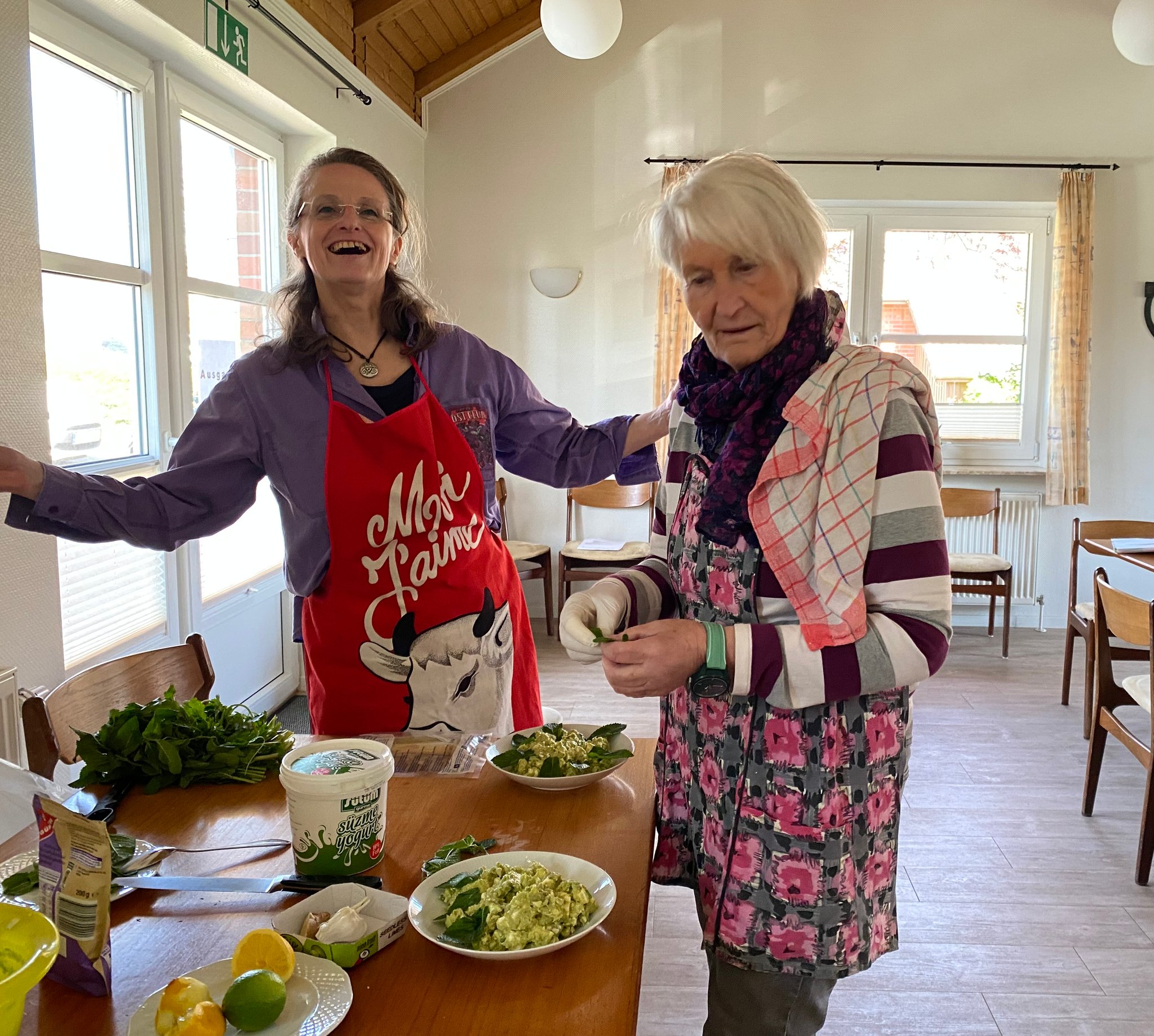 Kräuter, Nüsse, Beeren und teils exotische Gewürze sorgten bei den Rezepten für den besonderen Pfiff, und in fröhlicher Runde wagten sich die gebildeten Zweierteams unter anderem an Avocado mit Granatapfelsirup, Vollkornnudeln mit Erbsenpesto, Hähnchenspießen mit Ingwer und Kurkuma oder das Aprikosen-Fool.